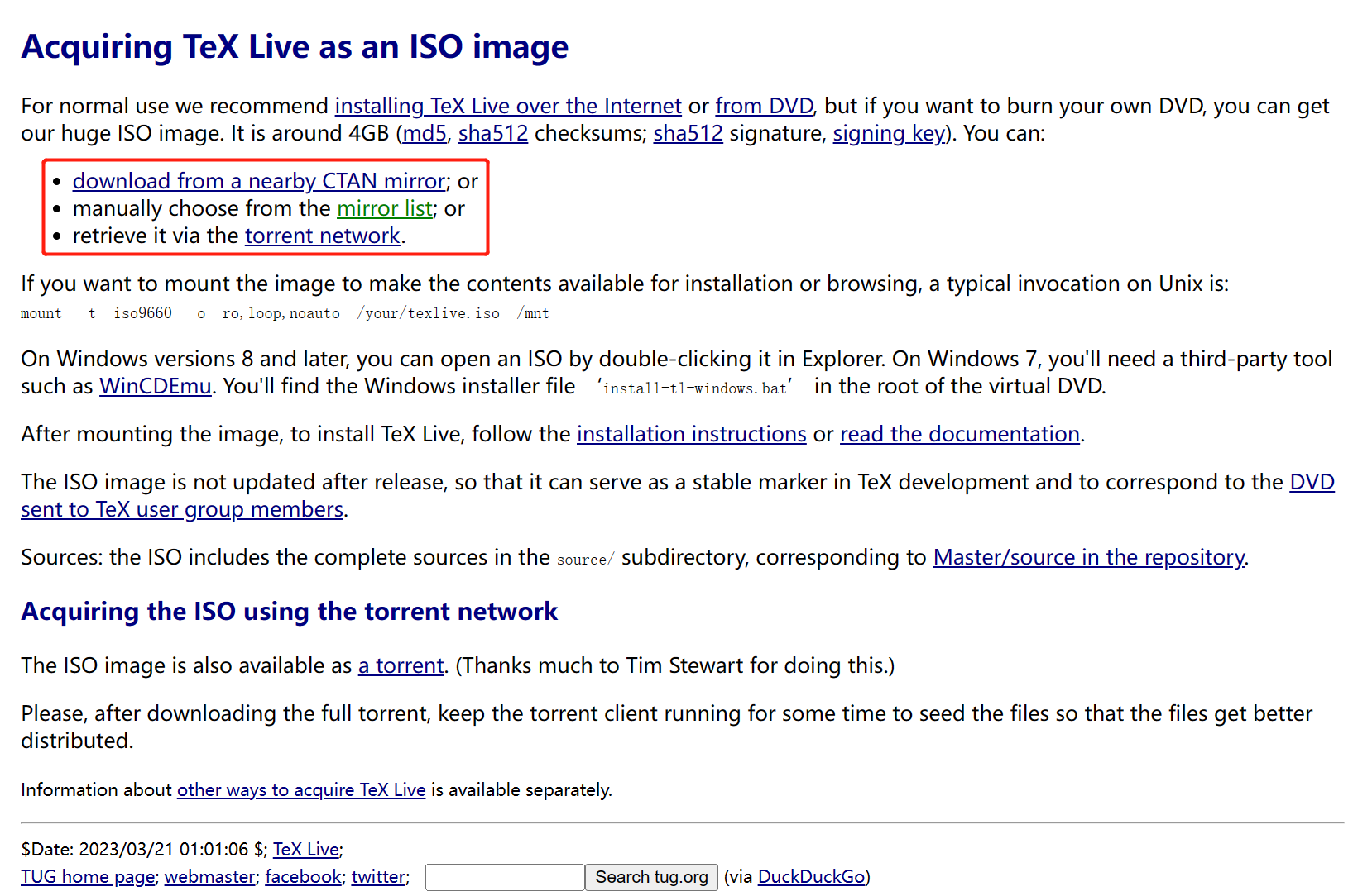 • Install TexLive via ISO image, you can choose download from a nearby CTAN mirror or manually choose CTAN mirror.