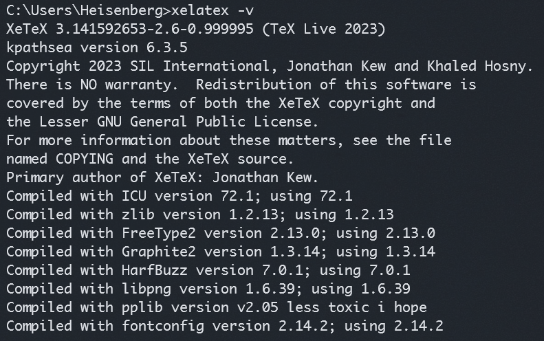 • Check if the installation is successful. Use xelatex -v in CMD.